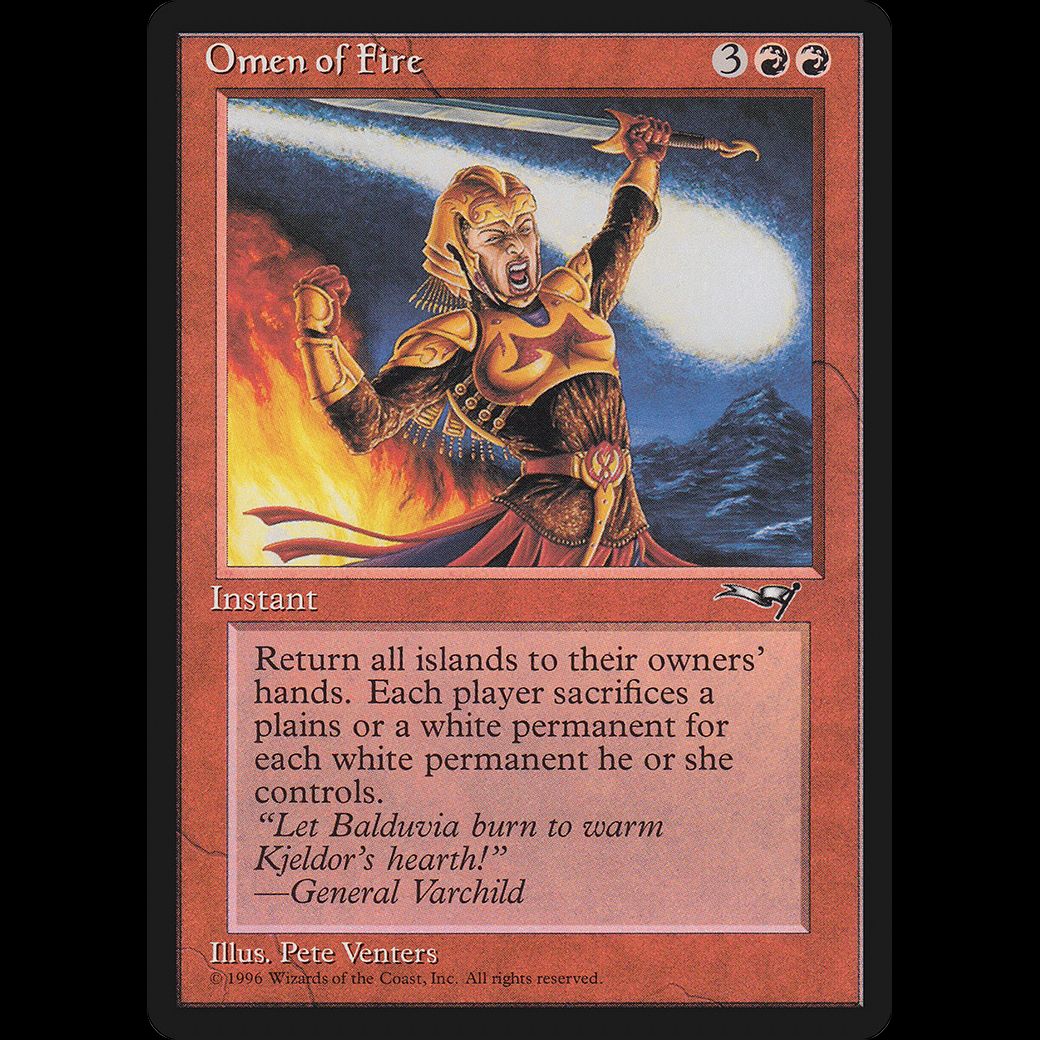 Return all Islands to their owners' hands. Each player sacrifices a Plains or a white permanent for each white permanent they control.