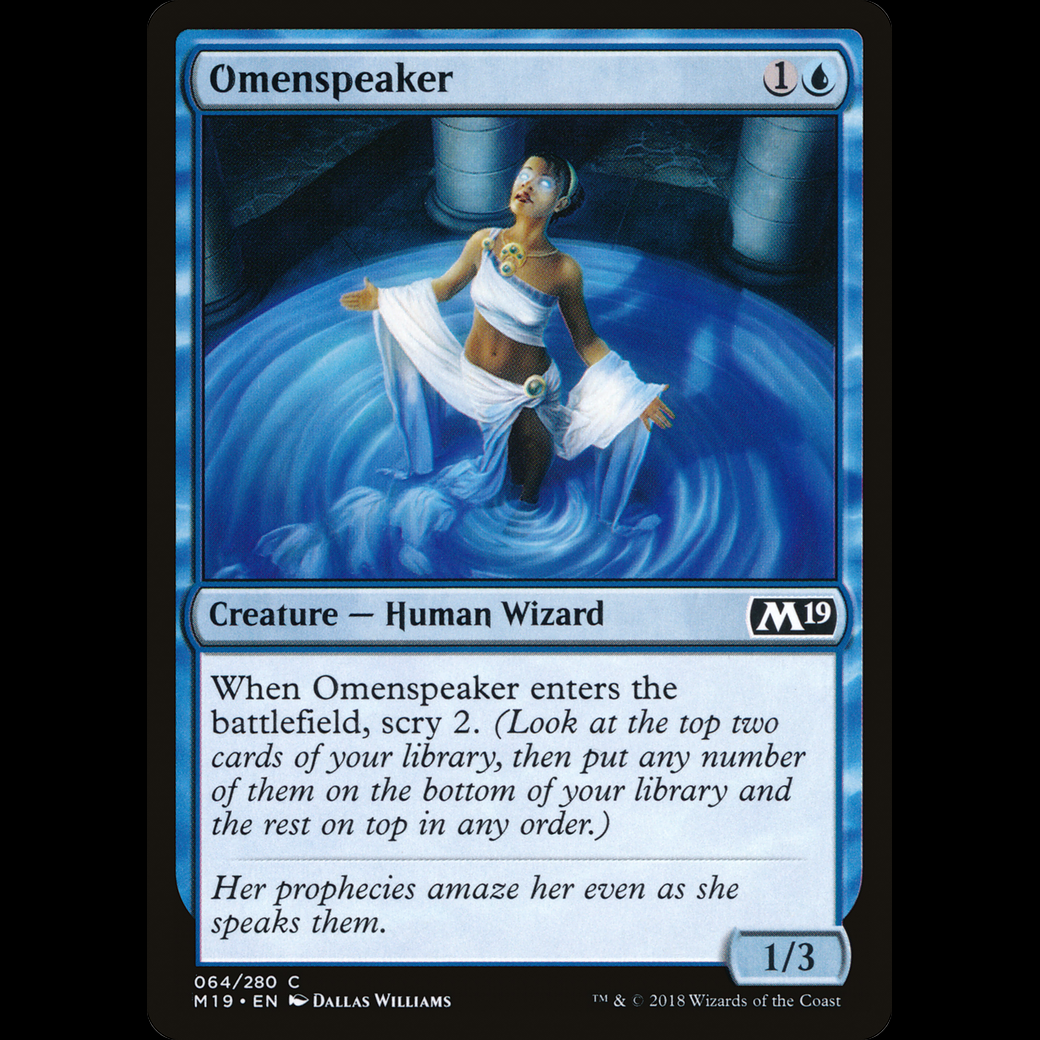 When Omenspeaker enters the battlefield, scry 2. (Look at the top two cards of your library, then put any number of them on the bottom of your library and the rest on top in any order.)