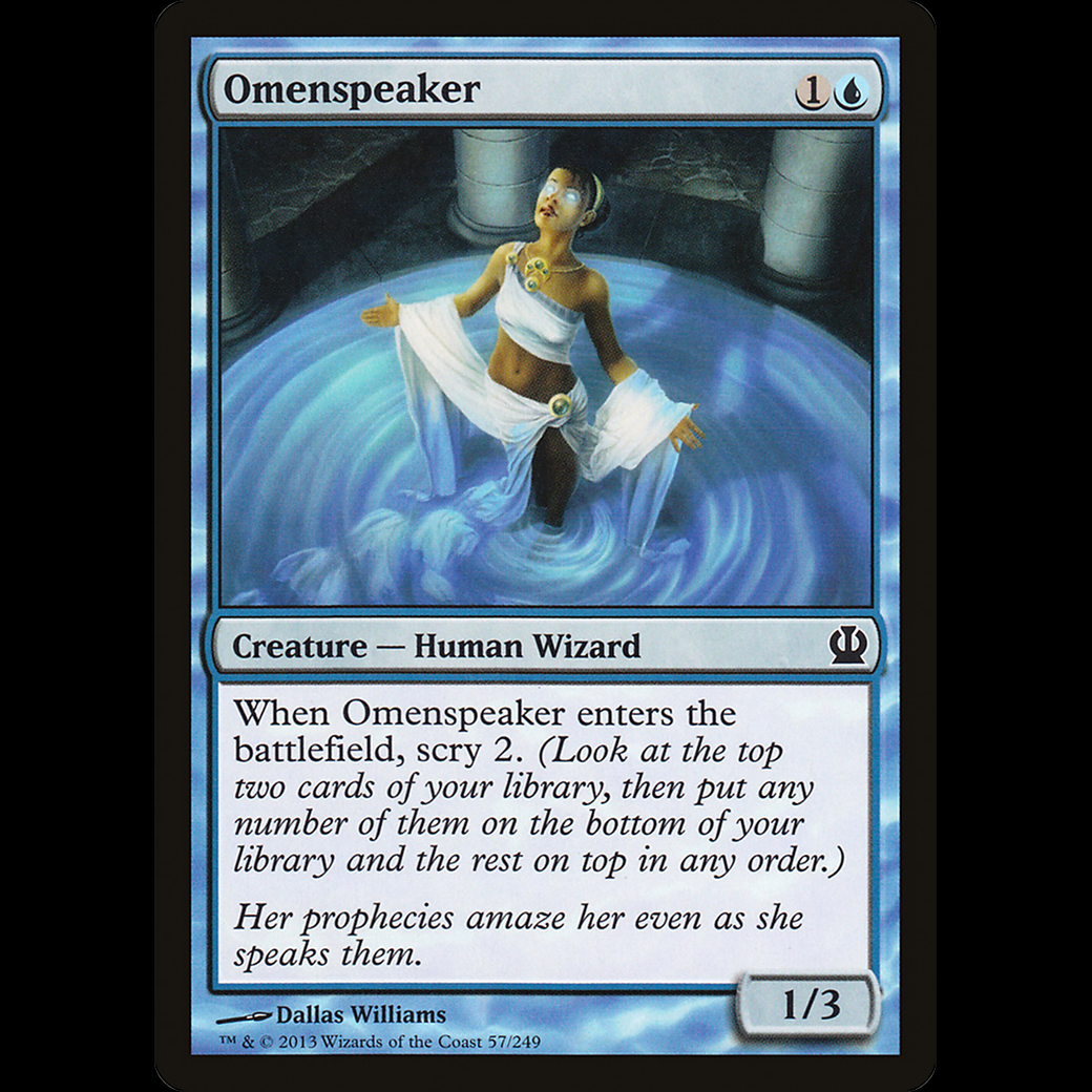 When Omenspeaker enters the battlefield, scry 2. (Look at the top two cards of your library, then put any number of them on the bottom of your library and the rest on top in any order.)