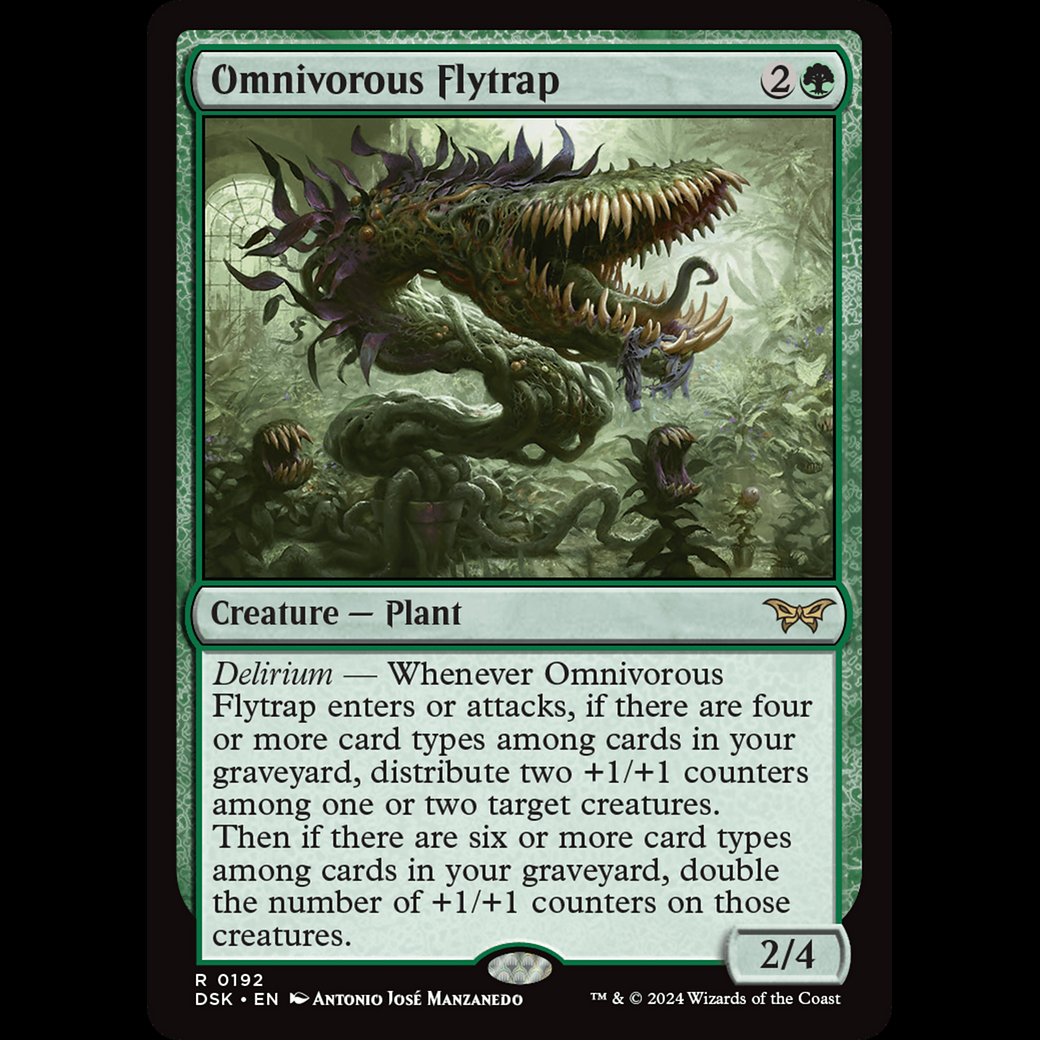 Delirium — Whenever Omnivorous Flytrap enters or attacks, if there are four or more card types among cards in your graveyard, distribute two +1/+1 counters among one or two target creatures. Then if there are six or more card types among cards in your graveyard, double the number of +1/+1 counters on those creatures.