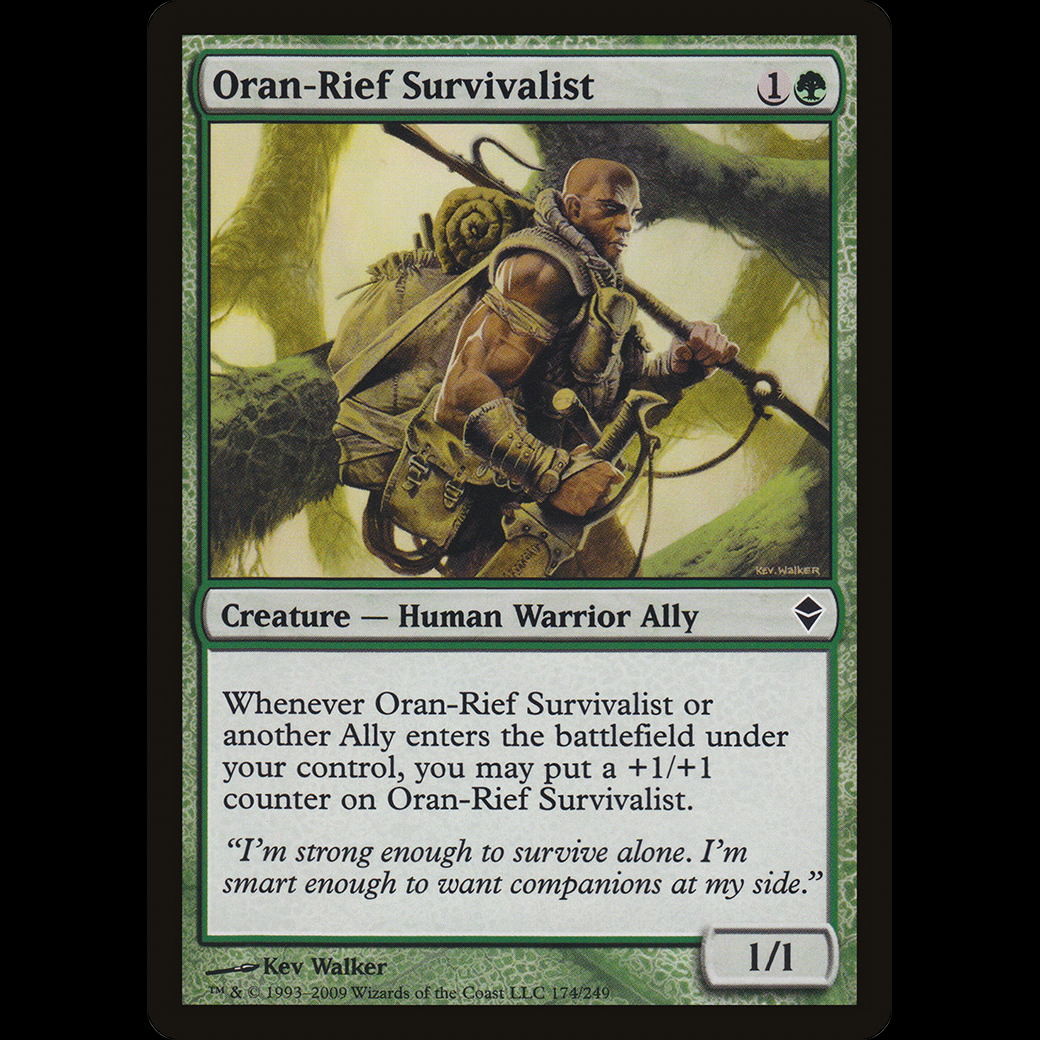 Whenever Oran-Rief Survivalist or another Ally enters the battlefield under your control, you may put a +1/+1 counter on Oran-Rief Survivalist.
