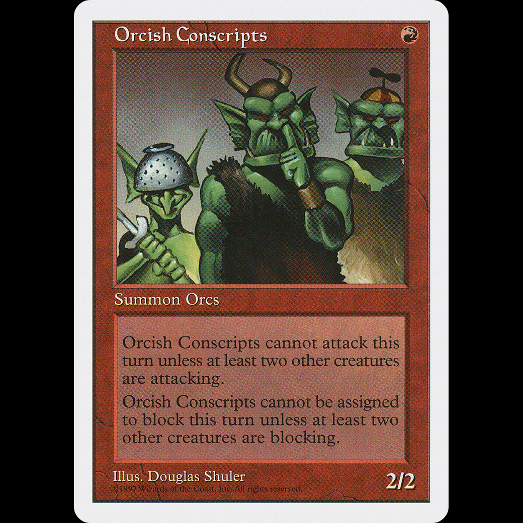 Orcish Conscripts can't attack unless at least two other creatures attack.