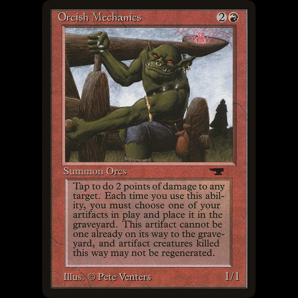 MTG Orcish Mechanics Antiquities , Sacrifice an artifact: Orcish Mechanics deals 2 damage to any target.