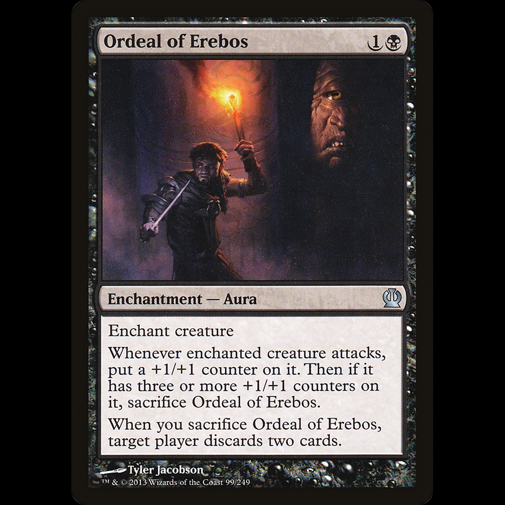 Whenever enchanted creature attacks, put a +1/+1 counter on it. Then if it has three or more +1/+1 counters on it, sacrifice Ordeal of Erebos.