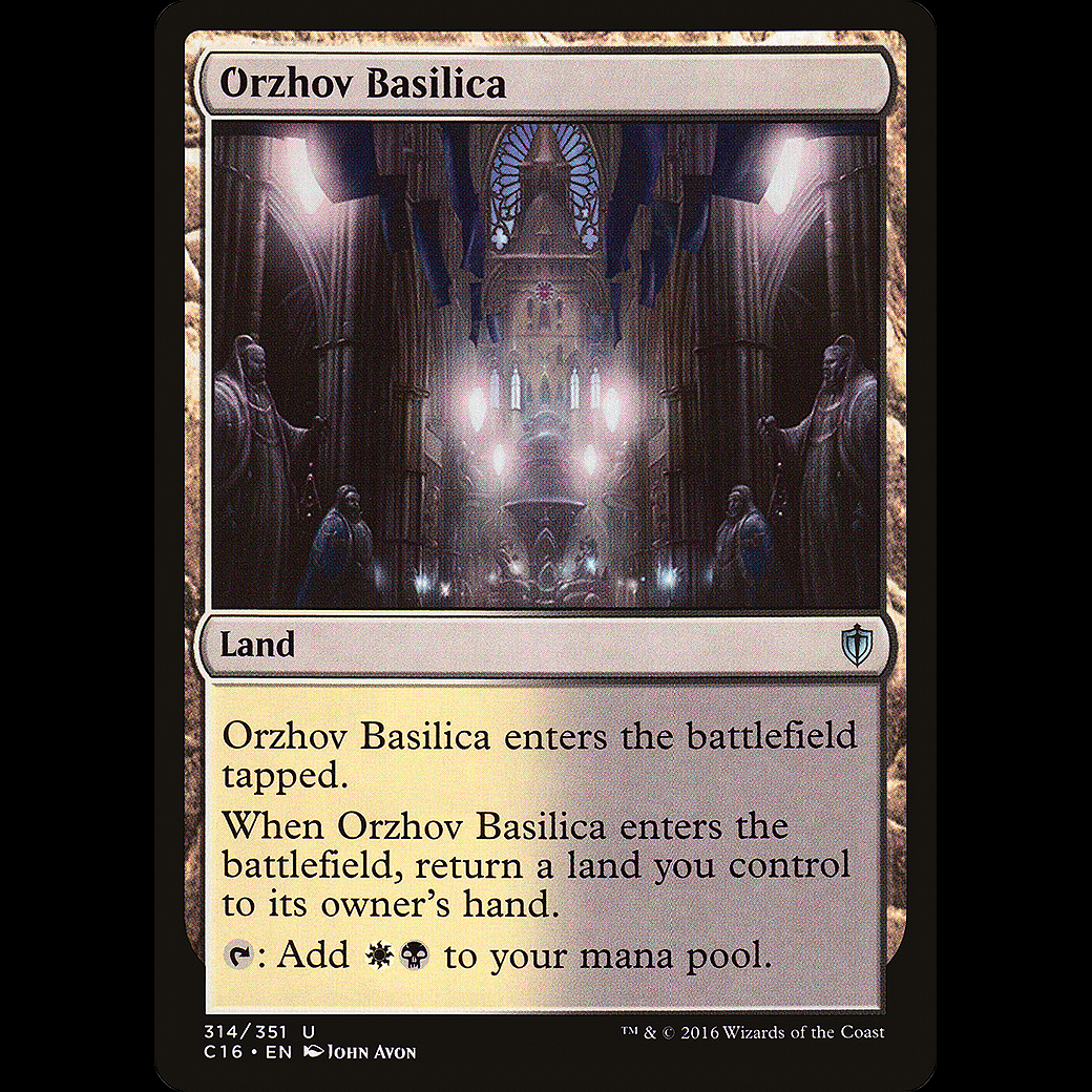 When Orzhov Basilica enters the battlefield, return a land you control to its owner's hand.
