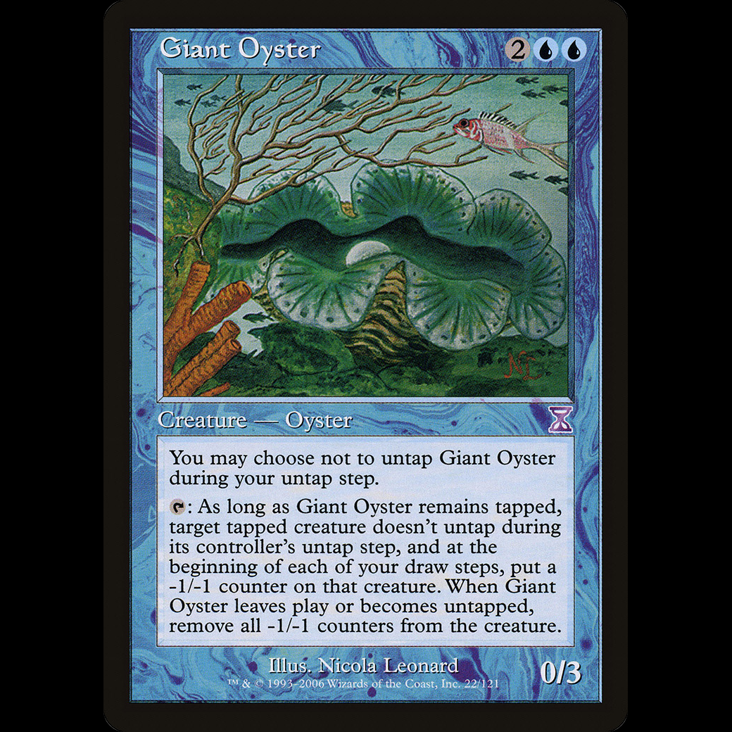 : For as long as Giant Oyster remains tapped, target tapped creature doesn't untap during its controller's untap step, and at the beginning of each of your draw steps, put a -1/-1 counter on that creature. When Giant Oyster leaves the battlefield or becomes untapped, remove all -1/-1 counters from the creature.