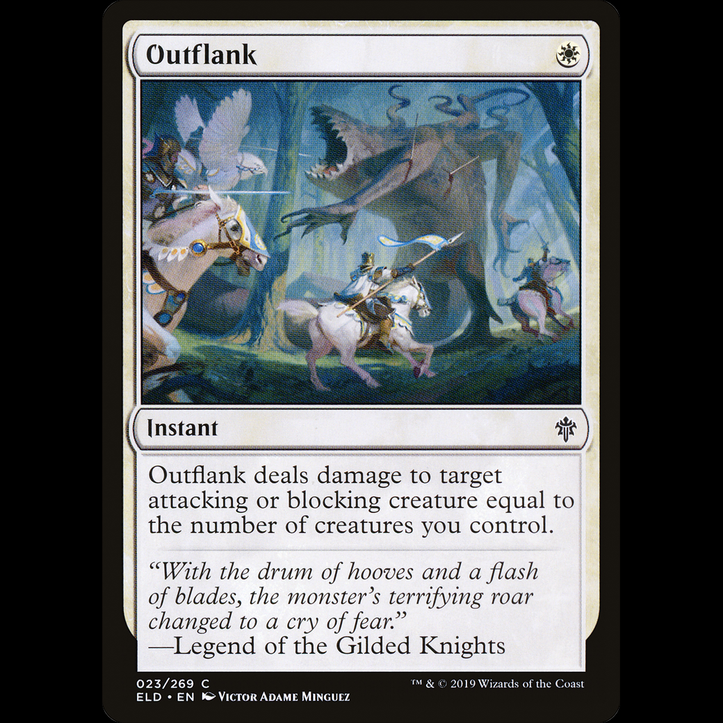 Outflank deals damage to target attacking or blocking creature equal to the number of creatures you control.