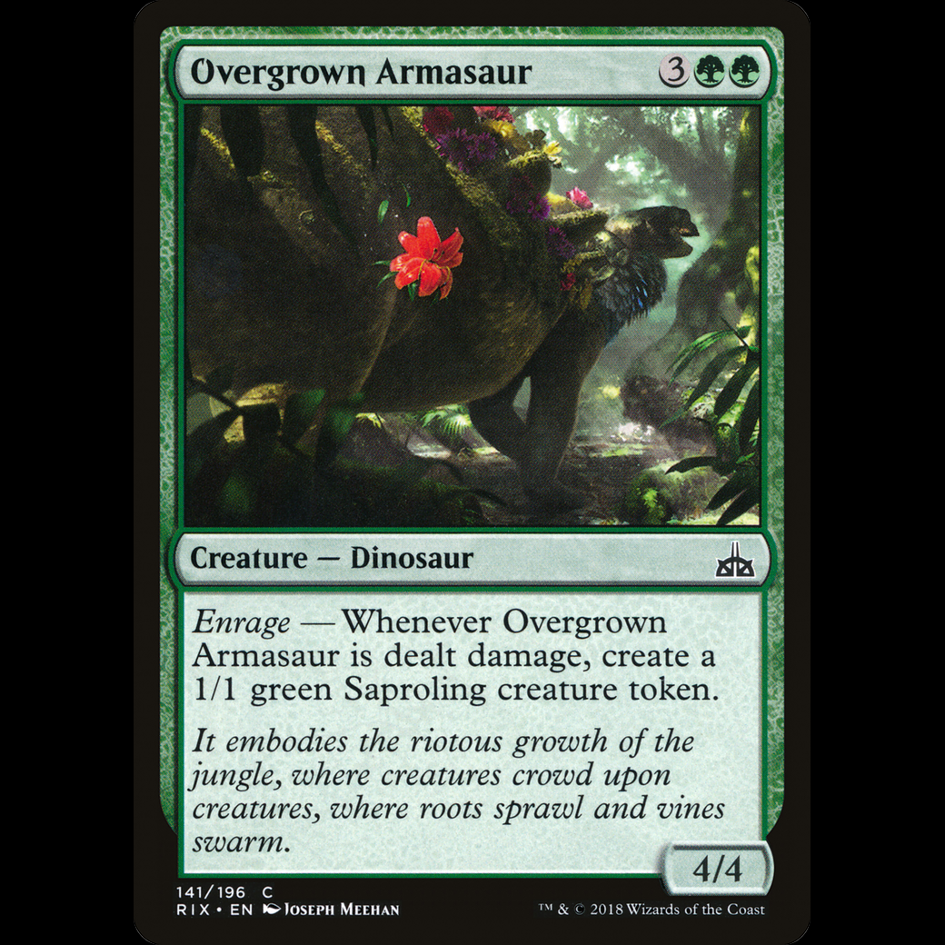 Enrage — Whenever Overgrown Armasaur is dealt damage, create a 1/1 green Saproling creature token.