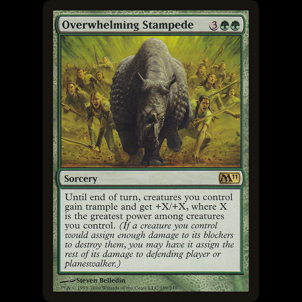 MTG Overwhelming Stampede Magic 2011 Until end of turn, creatures you control gain trample and get +X/+X, where X is the greatest power among creatures you control.