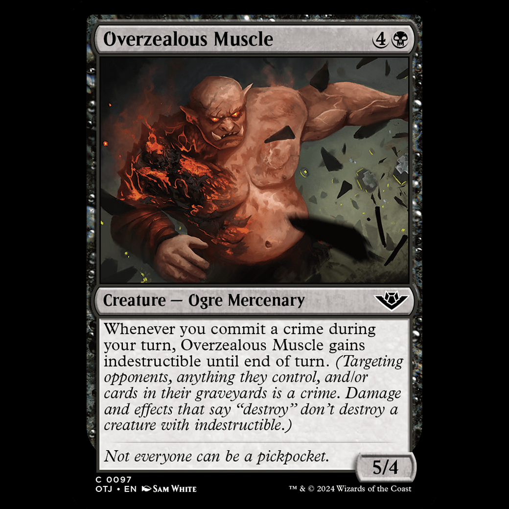Whenever you commit a crime during your turn, Overzealous Muscle gains indestructible until end of turn. (Targeting opponents, anything they control, and/or cards in their graveyards is a crime. Damage and effects that say "destroy" don't destroy a creature with indestructible.)