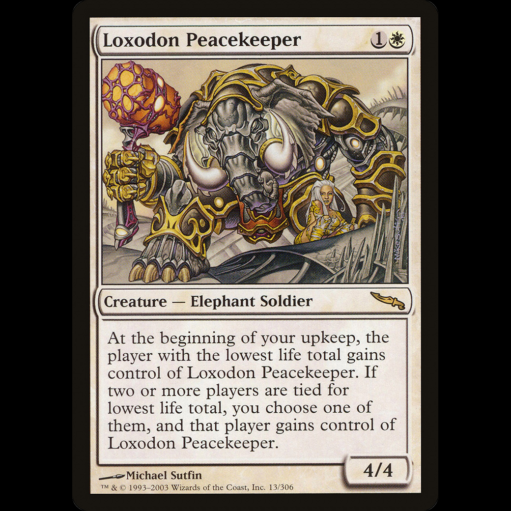 At the beginning of your upkeep, the player with the lowest life total gains control of Loxodon Peacekeeper. If two or more players are tied for lowest life total, you choose one of them, and that player gains control of Loxodon Peacekeeper.
