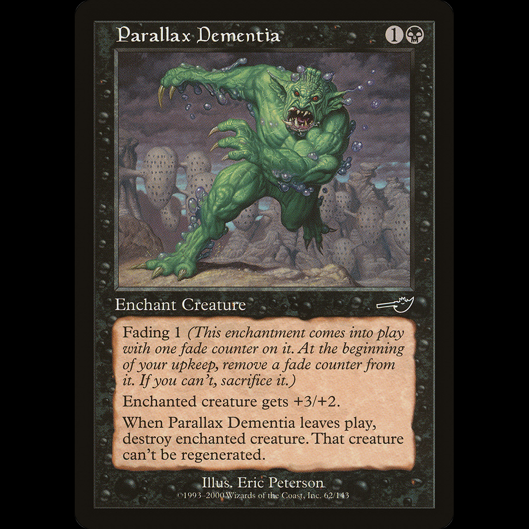 When Parallax Dementia leaves the battlefield, destroy enchanted creature. That creature can't be regenerated.