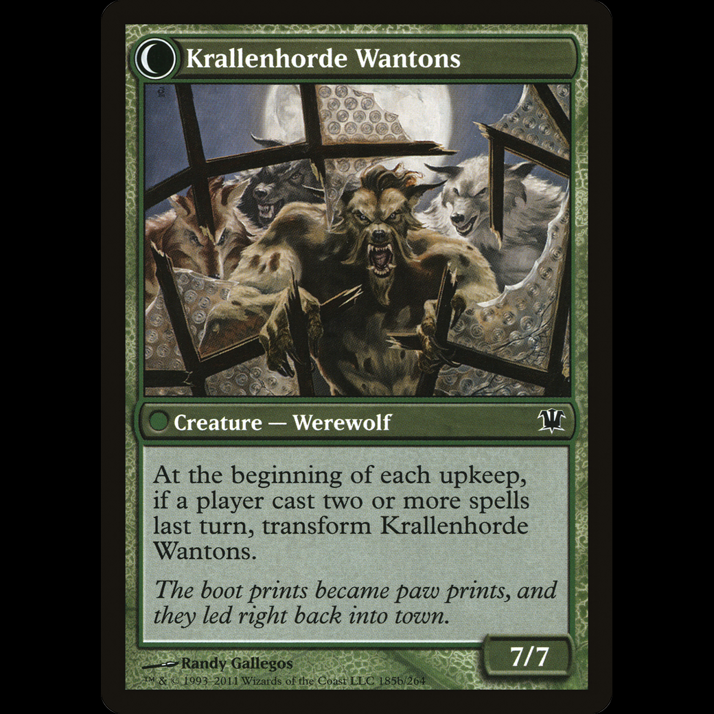 At the beginning of each upkeep, if a player cast two or more spells last turn, transform Krallenhorde Wantons.