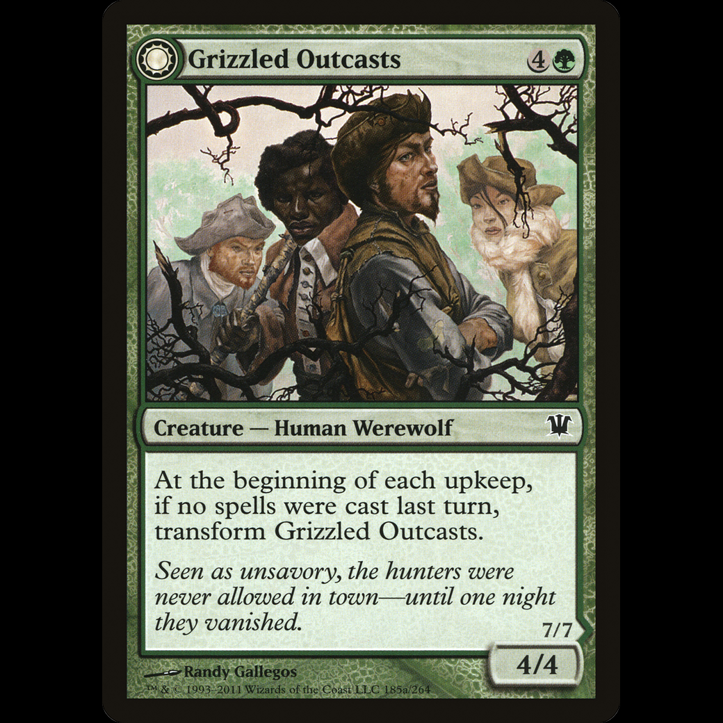 At the beginning of each upkeep, if no spells were cast last turn, transform Grizzled Outcasts.