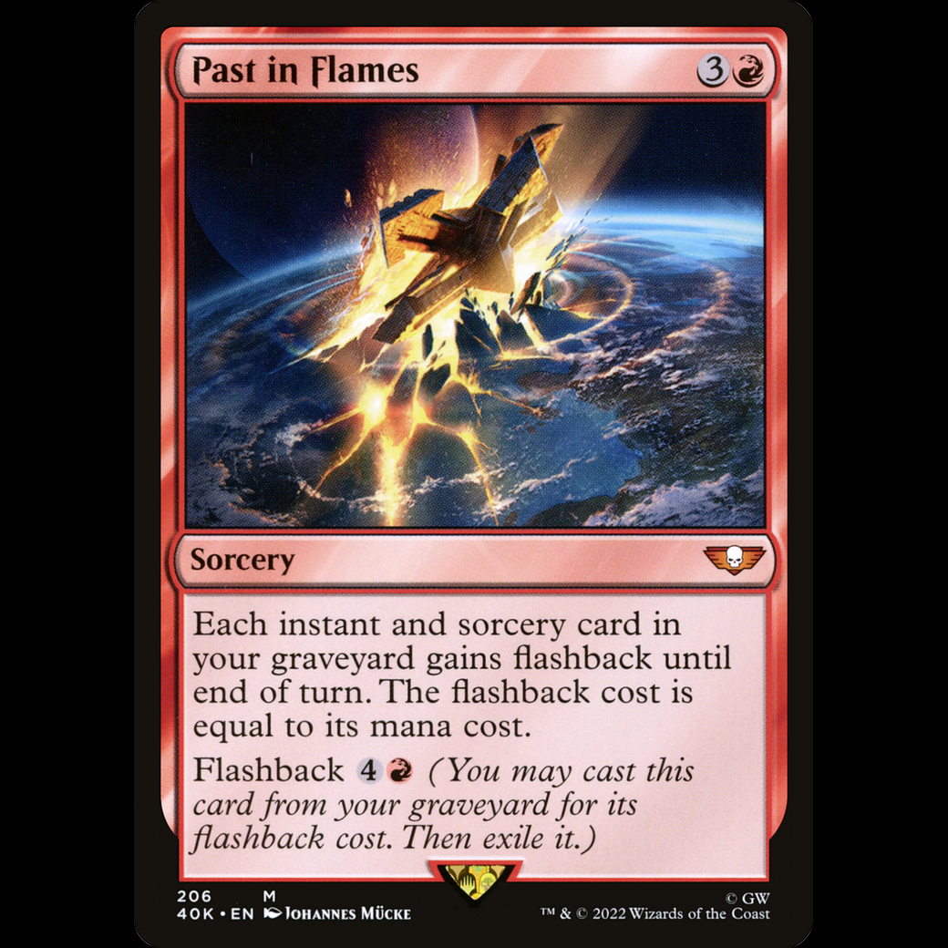 MTG Past in Flames Warhammer 40,000 Commander 40k#206 Each instant and sorcery card in your graveyard gains flashback until end of turn. The flashback cost is equal to its mana cost. Flashback (You may cast this card from your graveyard for its flashback cost. Then exile it.)