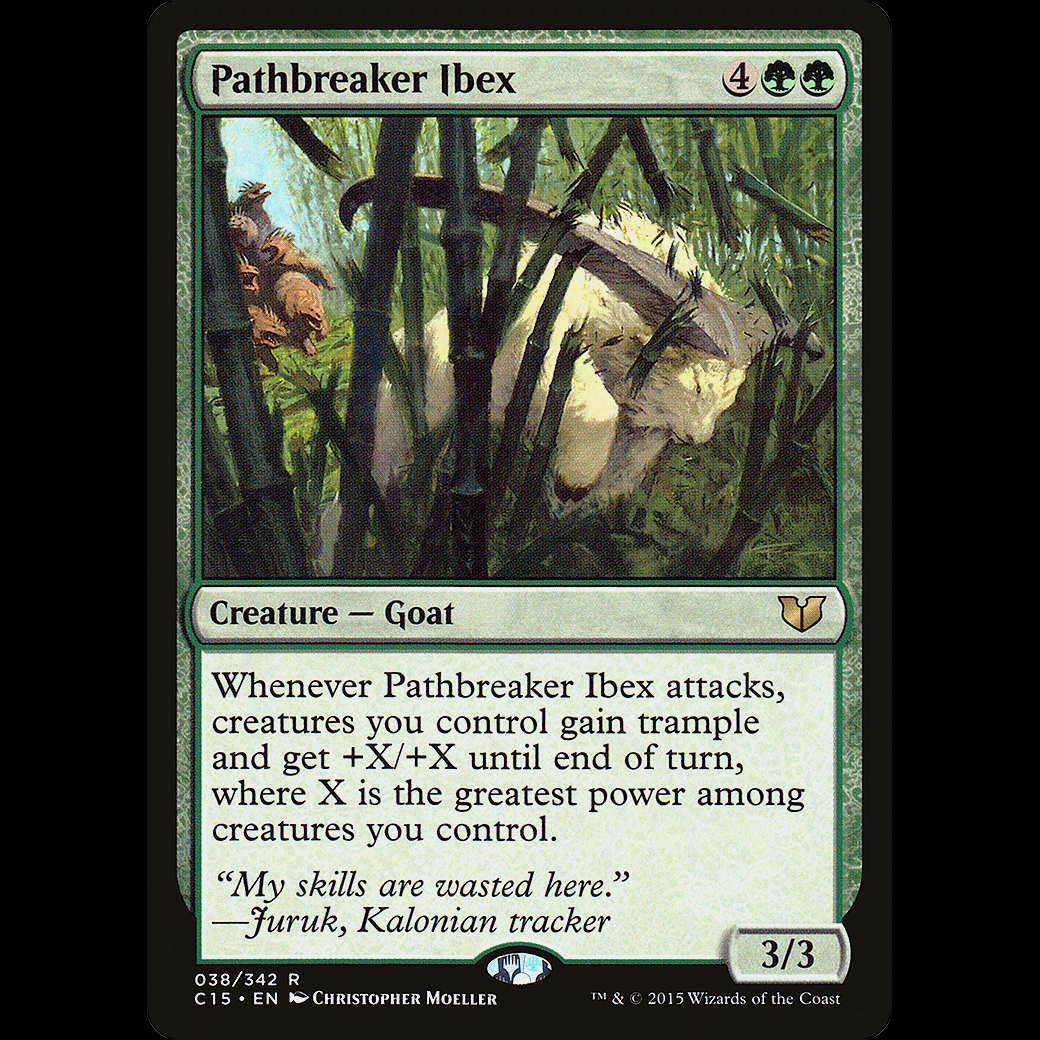 MTG Pathbreaker Ibex Commander 2015 Whenever Pathbreaker Ibex attacks, creatures you control gain trample and get +X/+X until end of turn, where X is the greatest power among creatures you control.
