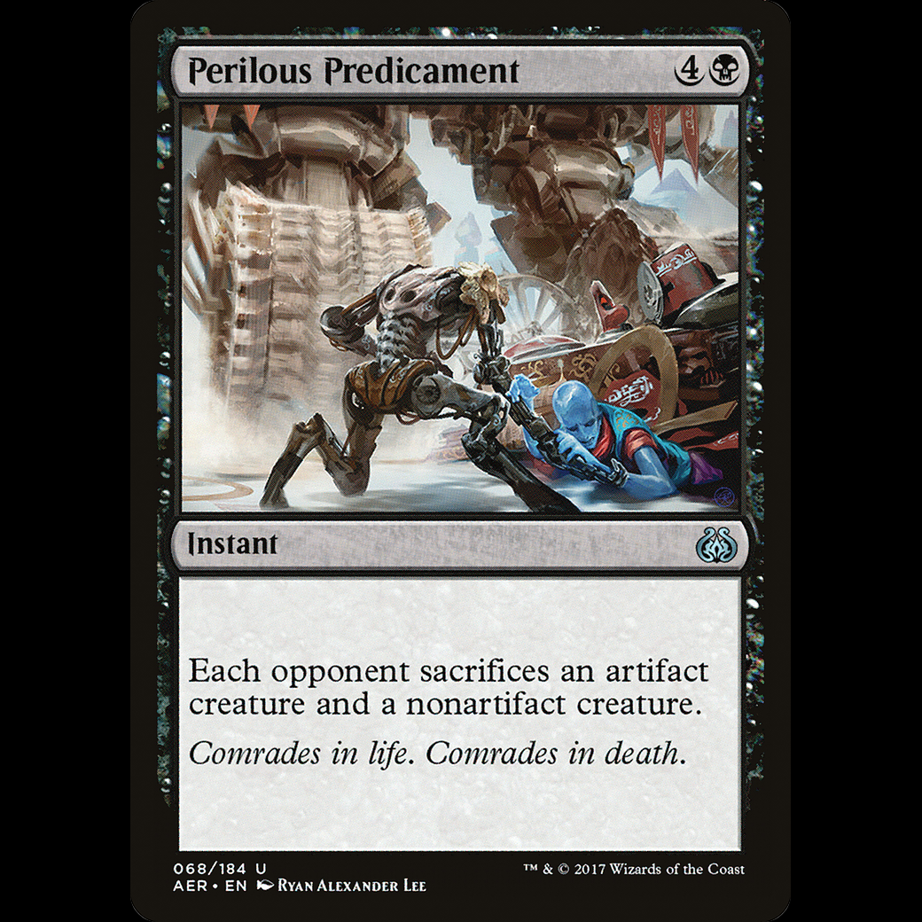 Each opponent sacrifices an artifact creature and a nonartifact creature.