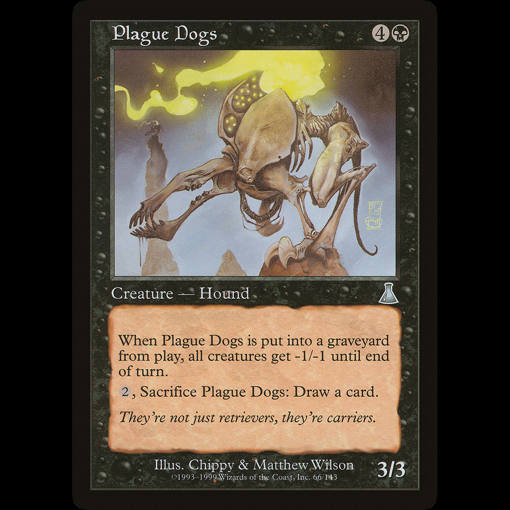 When Plague Dogs dies, all creatures get -1/-1 until end of turn.