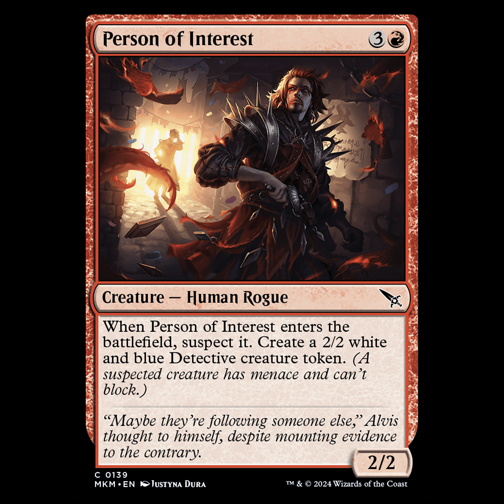 When Person of Interest enters the battlefield, suspect it. Create a 2/2 white and blue Detective creature token. (A suspected creature has menace and can't block.)