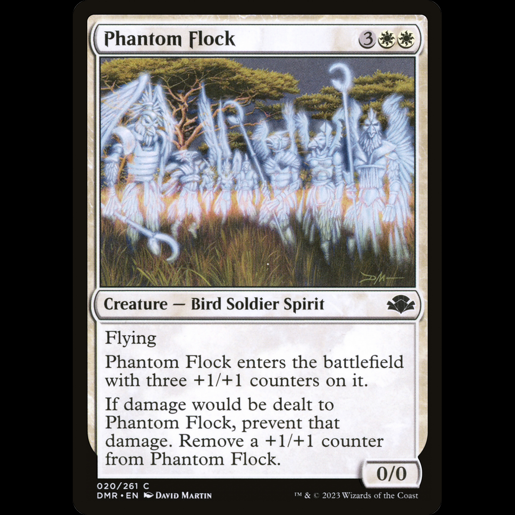 If damage would be dealt to Phantom Flock, prevent that damage. Remove a +1/+1 counter from Phantom Flock.