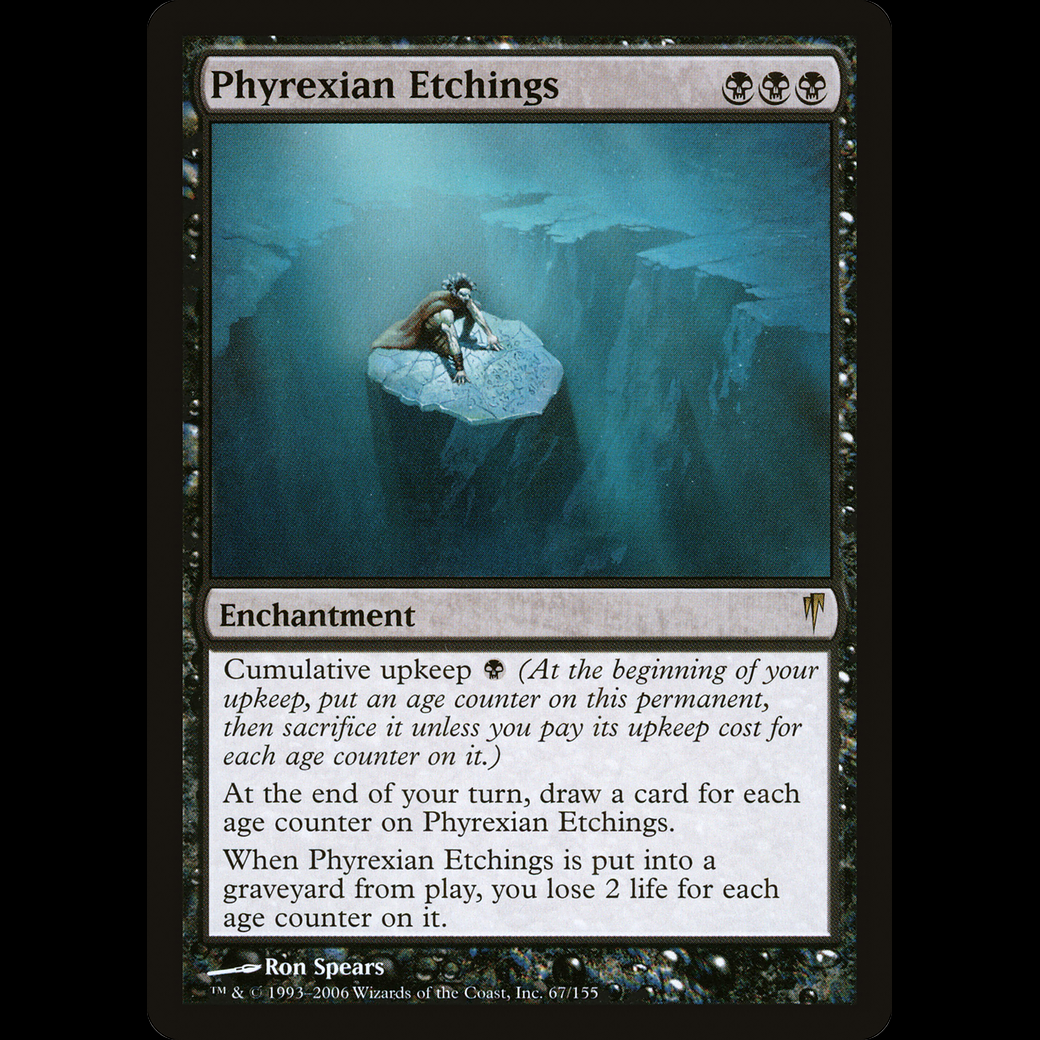 At the beginning of your end step, draw a card for each age counter on Phyrexian Etchings.