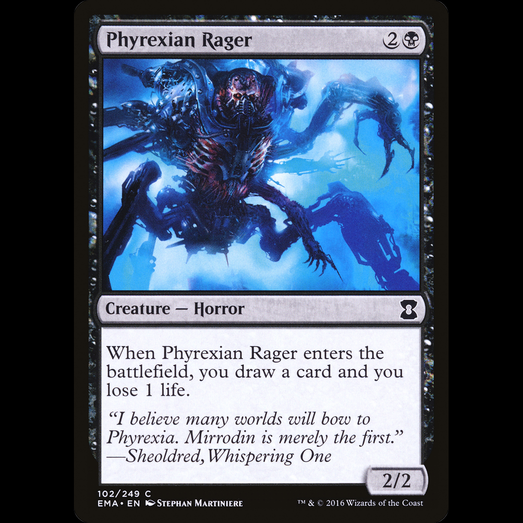 When Phyrexian Rager enters the battlefield, you draw a card and you lose 1 life.