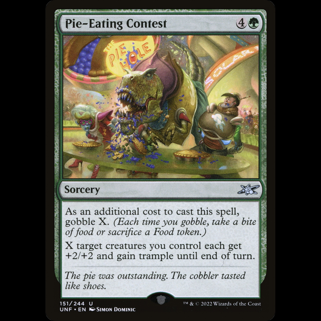 As an additional cost to cast this spell, gobble X. (Each time you gobble, take a bite of food or sacrifice a Food token.) X target creatures you control each get +2/+2 and gain trample until end of turn.