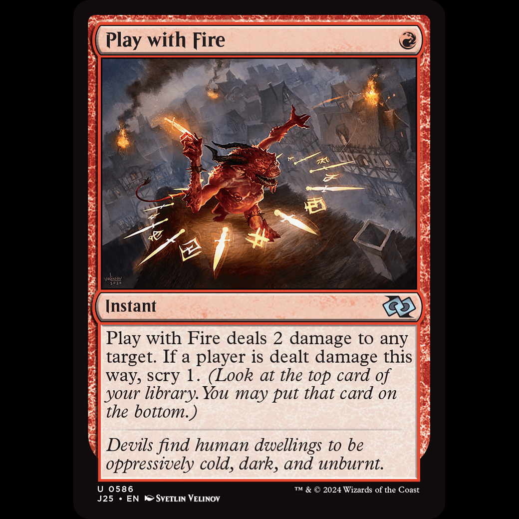 Play with Fire deals 2 damage to any target. If a player is dealt damage this way, scry 1. (Look at the top card of your library. You may put that card on the bottom.)