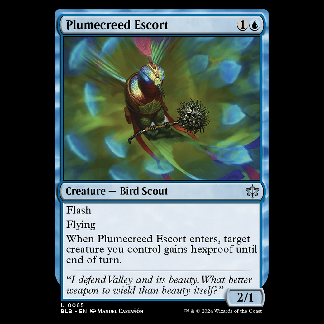 When Plumecreed Escort enters, target creature you control gains hexproof until end of turn.