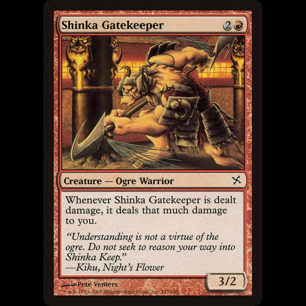 Whenever Shinka Gatekeeper is dealt damage, it deals that much damage to you.