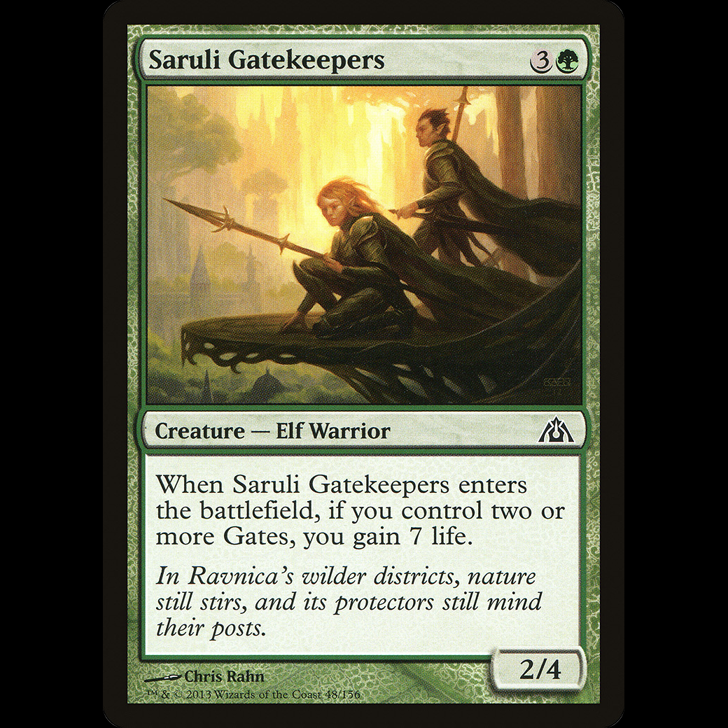 When Saruli Gatekeepers enters the battlefield, if you control two or more Gates, you gain 7 life.