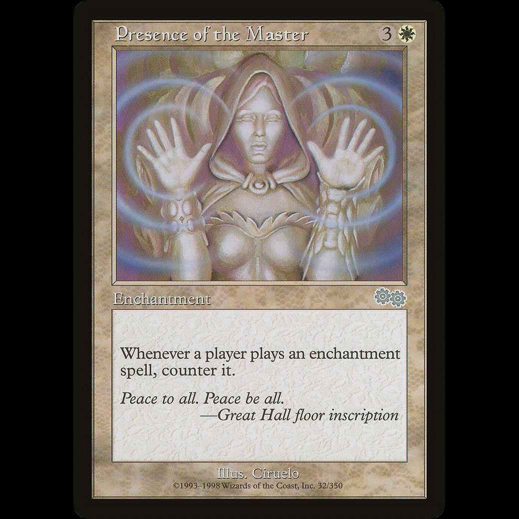 MTG Presence of the Master Urza's SagaWhenever a player casts an enchantment spell, counter it.