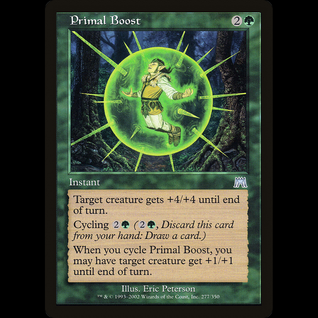 When you cycle Primal Boost, you may have target creature get +1/+1 until end of turn.