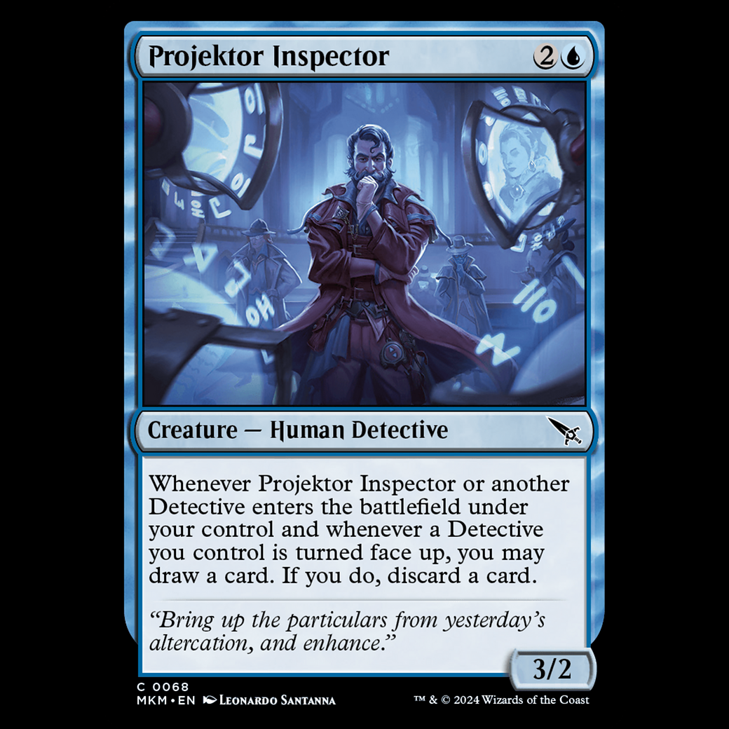 Whenever Projektor Inspector or another Detective enters the battlefield under your control and whenever a Detective you control is turned face up, you may draw a card. If you do, discard a card.