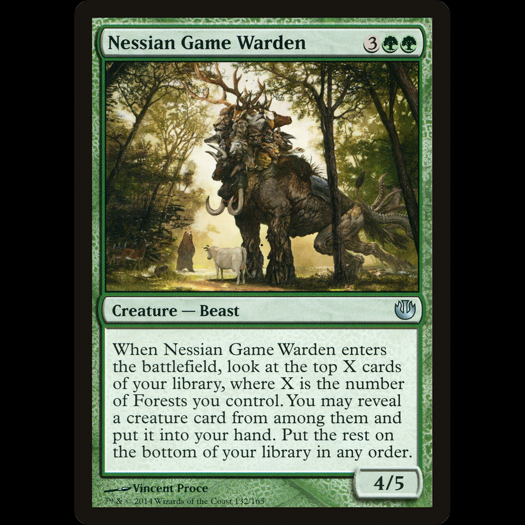 When Nessian Game Warden enters the battlefield, look at the top X cards of your library, where X is the number of Forests you control. You may reveal a creature card from among them and put it into your hand. Put the rest on the bottom of your library in any order.