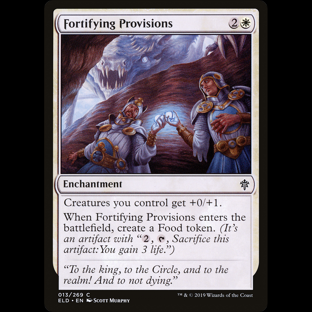 MTG Provisiones fortalecedoras (Fortifying Provisions) Throne of Eldraine eld#13Creatures you control get +0/+1. When this enchantment enters, create a Food token. (It's an artifact with ", , Sacrifice this token: You gain 3 life.")