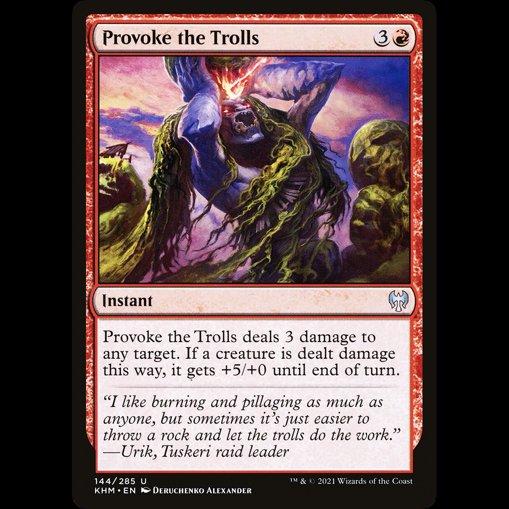 Provoke the Trolls deals 3 damage to any target. If a creature is dealt damage this way, it gets +5/+0 until end of turn.