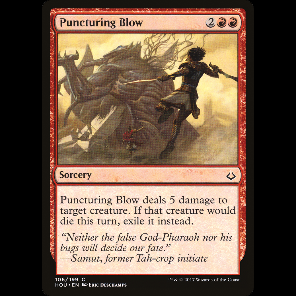 Puncturing Blow deals 5 damage to target creature. If that creature would die this turn, exile it instead.