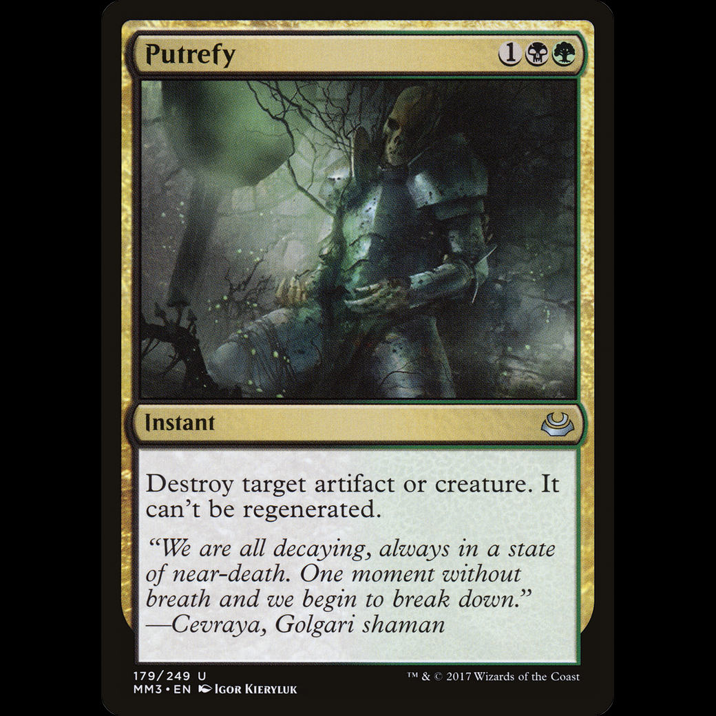 MTG Putrefy Modern Masters 2017Destroy target artifact or creature. It can't be regenerated.