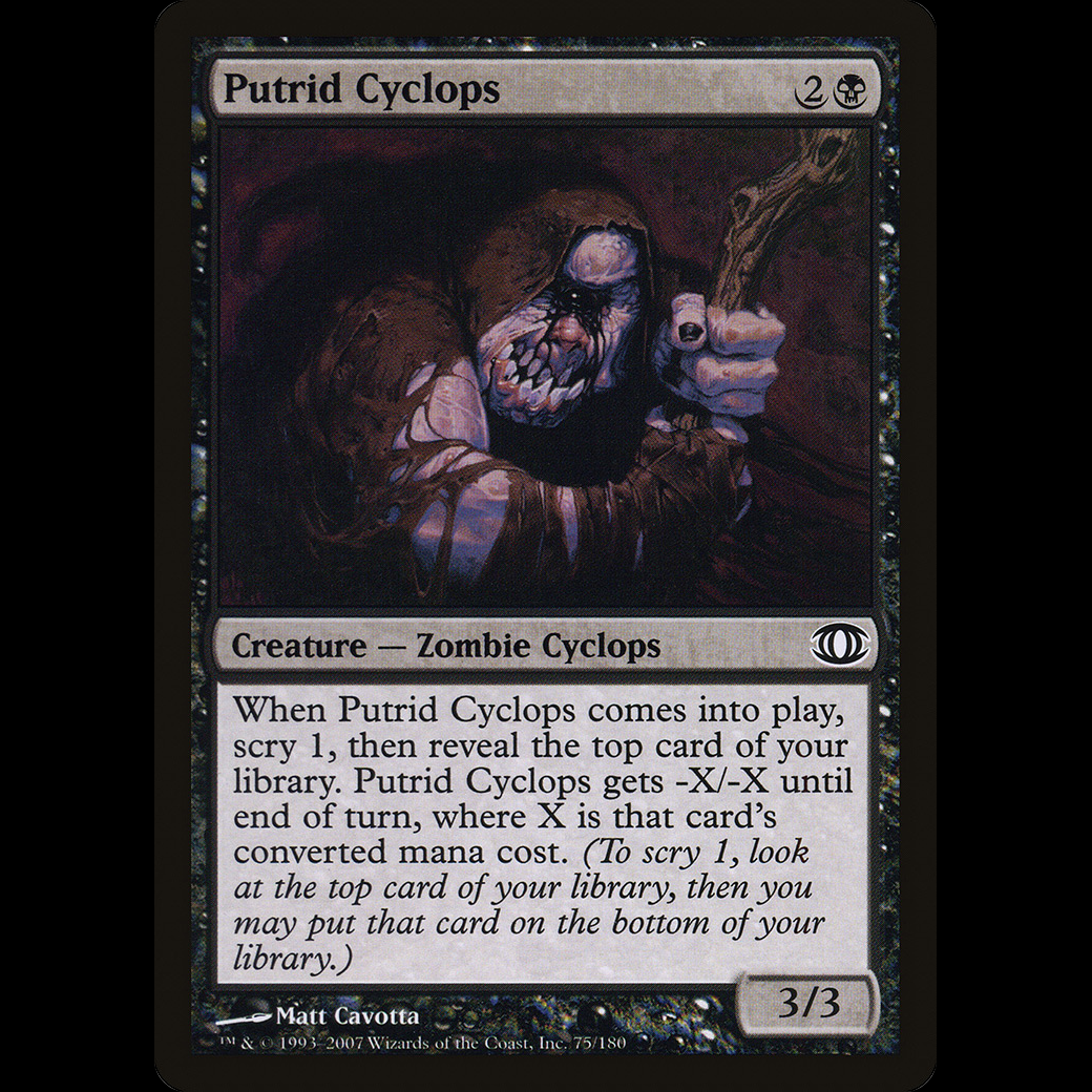 When Putrid Cyclops enters the battlefield, scry 1, then reveal the top card of your library. Putrid Cyclops gets -X/-X until end of turn, where X is that card's mana value. (To scry 1, look at the top card of your library, then you may put that card on the bottom of your library.)