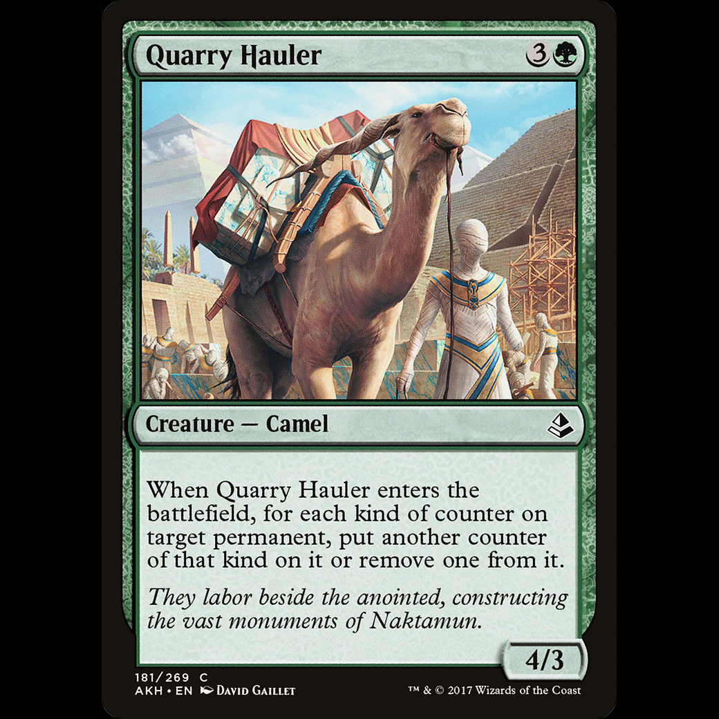 When Quarry Hauler enters the battlefield, for each kind of counter on target permanent, put another counter of that kind on it or remove one from it.