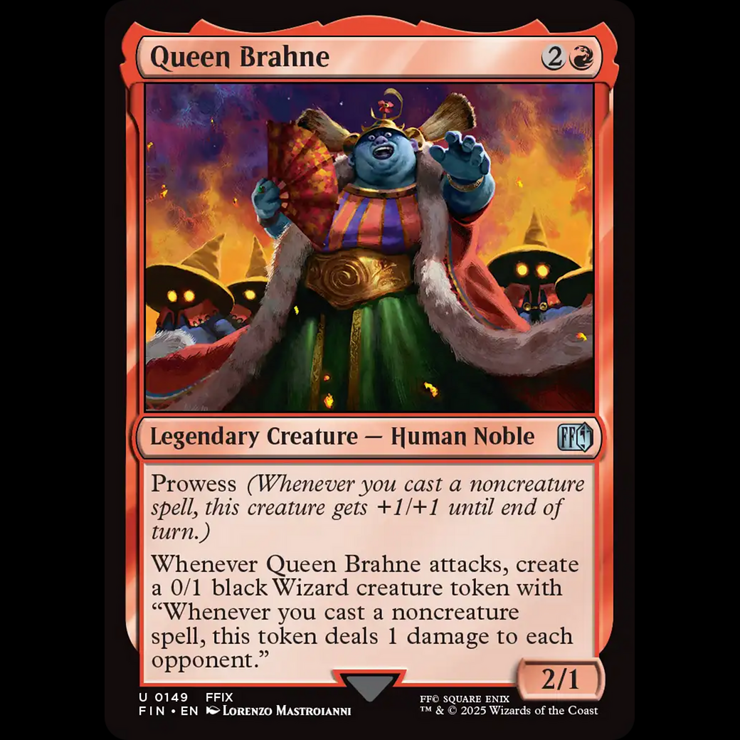 Whenever Queen Brahne attacks, create a 0/1 black Wizard creature token with "Whenever you cast a noncreature spell, this token deals 1 damage to each opponent."