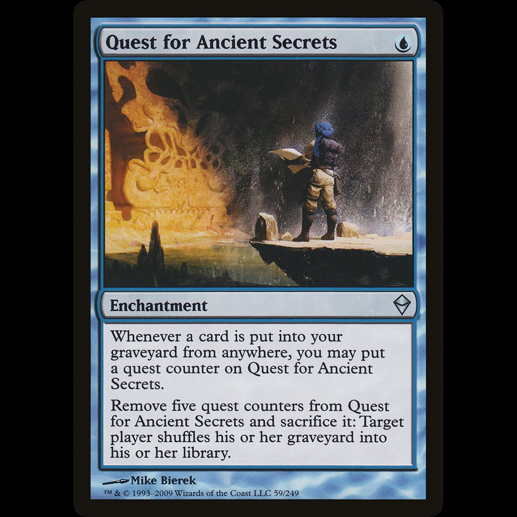 Remove five quest counters from Quest for Ancient Secrets and sacrifice it: Target player shuffles their graveyard into their library.