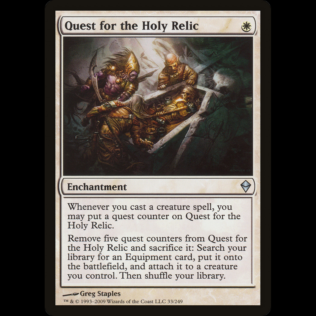 Remove five quest counters from Quest for the Holy Relic and sacrifice it: Search your library for an Equipment card, put it onto the battlefield, attach it to a creature you control, then shuffle.
