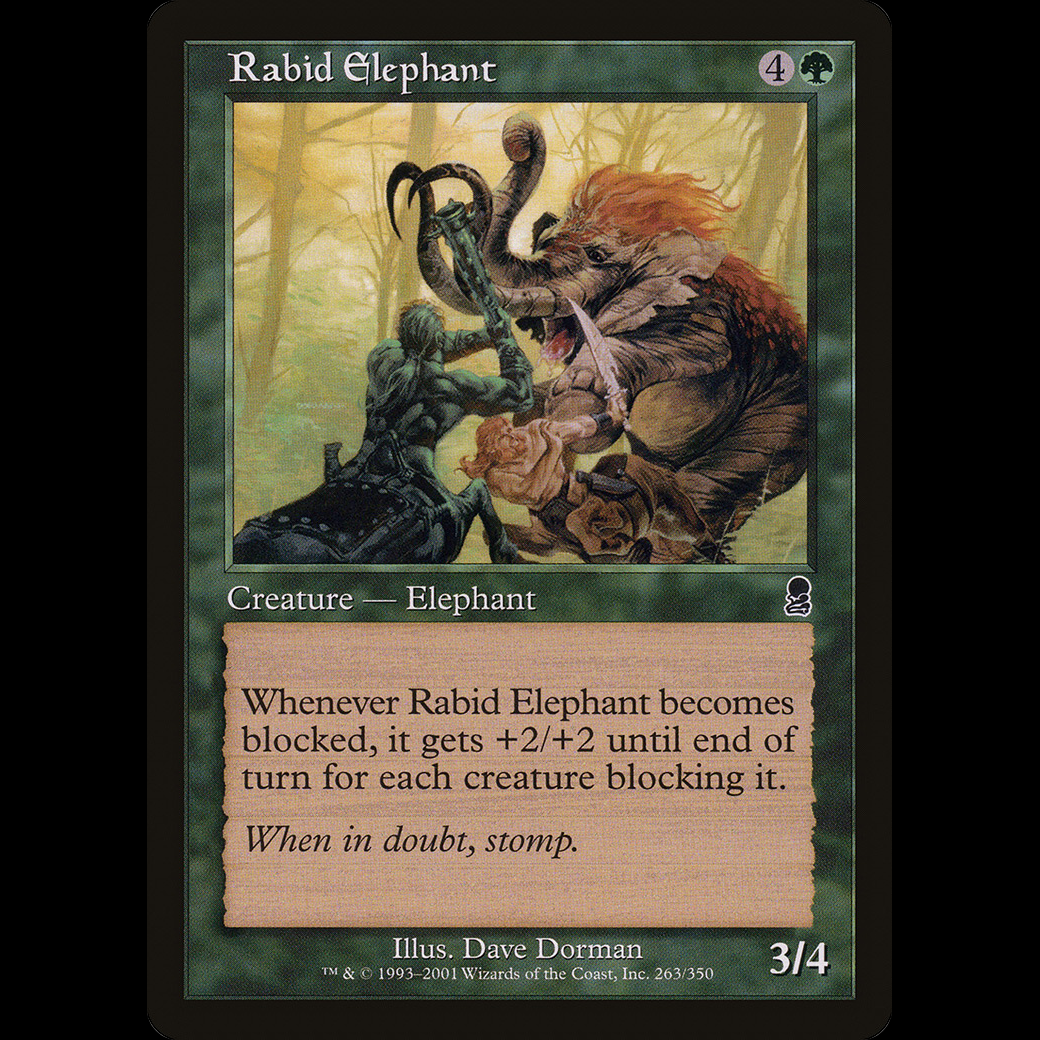 Whenever Rabid Elephant becomes blocked, it gets +2/+2 until end of turn for each creature blocking it.