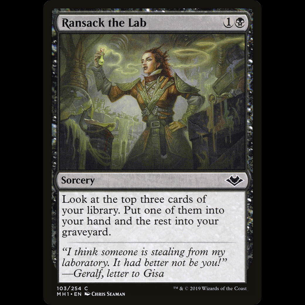 Look at the top three cards of your library. Put one of them into your hand and the rest into your graveyard.