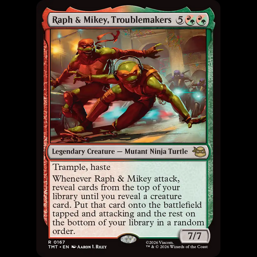 Trample, haste Whenever Raph & Mikey attack, reveal cards from the top of your library until you reveal a creature card. Put that card onto the battlefield tapped and attacking and the rest on the bottom of your library in a random order.