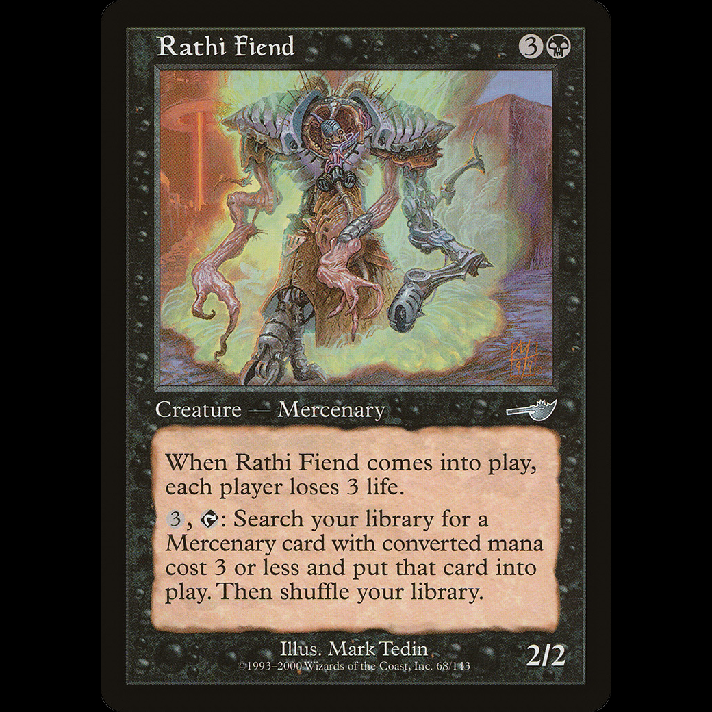 When Rathi Fiend enters the battlefield, each player loses 3 life.