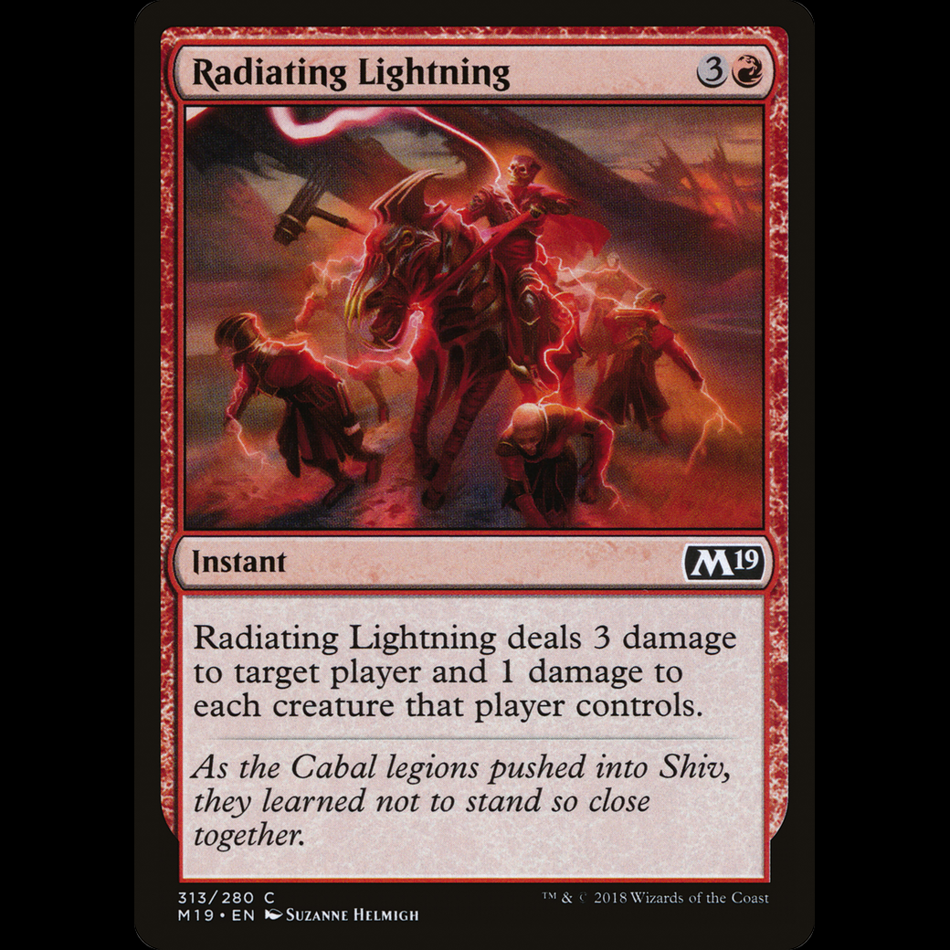 Radiating Lightning deals 3 damage to target player and 1 damage to each creature that player controls.