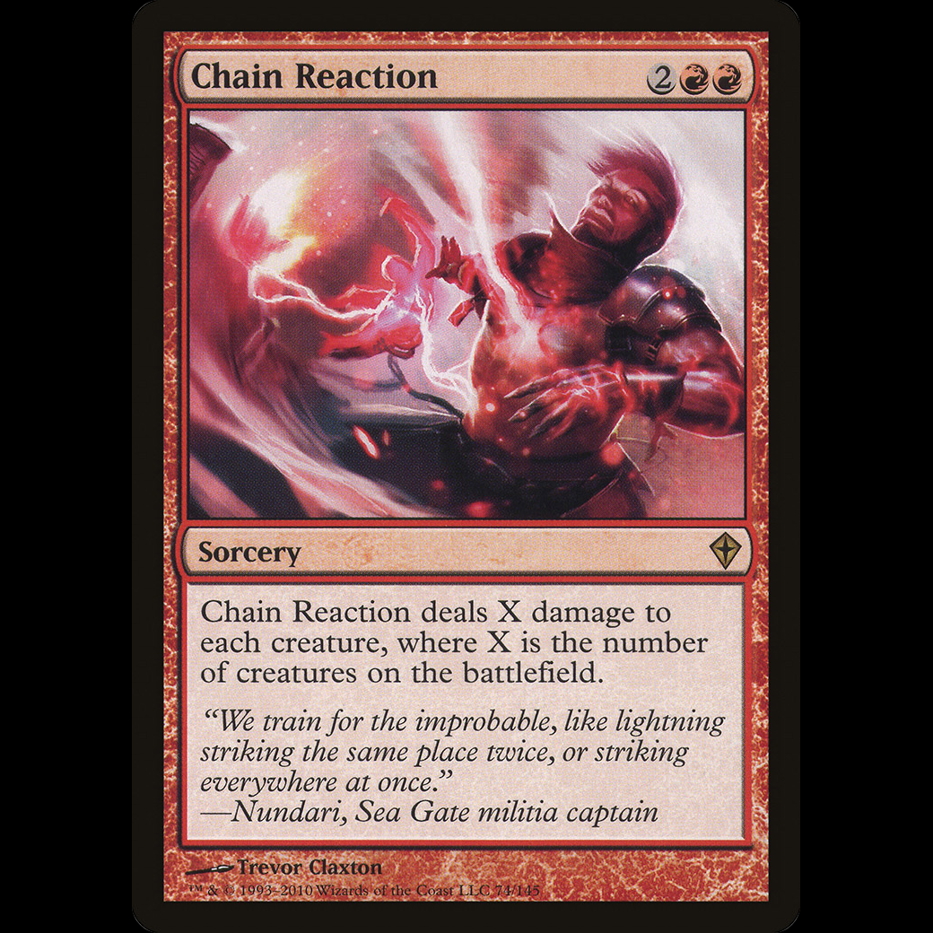 Chain Reaction deals X damage to each creature, where X is the number of creatures on the battlefield.